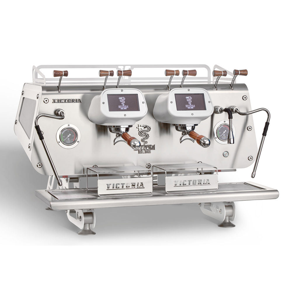 Top of the line coffee machine to cater to any of your needs from Traditional Espresso to Specialty Coffee. Beautiful industrial steel-wood design with wooden handles, portafilter.